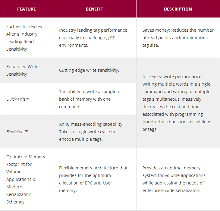 • The industry’s highest performing, mass-market optimized, RFID IC
