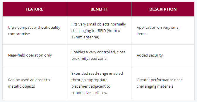 The “ALN-9613/ALN-9713” is especially well-suited for very small item-level applications where geometries are critical. The near-field coupling properties make this tag ideal where read range requirements are short or for applications on aqueous materials.
