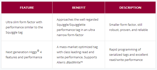 The Alien Technology® ALN-9745 “SlimLine” RFID inlay is a specialized thin-form factor high performance tag. The ALN-9745 brings all the Higgs®4 advantages to a tag that can fit in extremely narrow confined spaces.